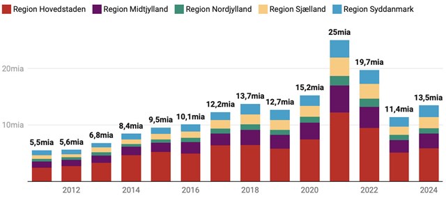 Diagrammet viser, hvor mange penge der blev købt bolig* for i januar måned i årene 2011 til 2024 i regionerne og totalt i Danmark.